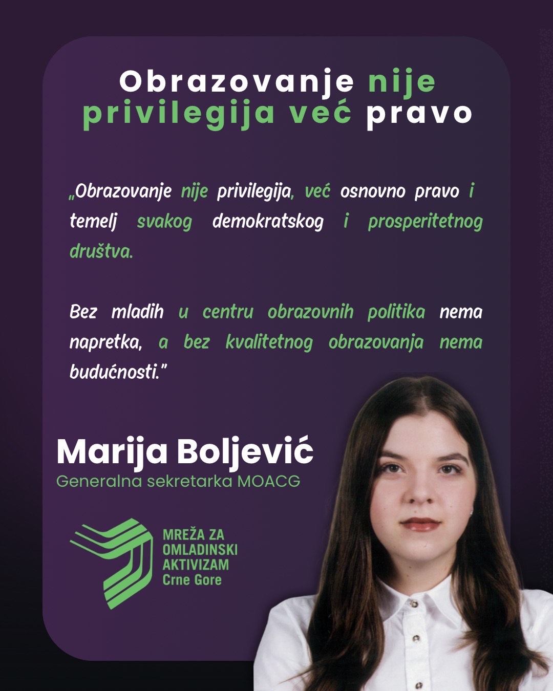 Obrazovanje nije privilegija, već osnovno pravo i temelj svakog demokratskog i prosperitetnog društva. Ono mora biti usmjereno na razvoj znanja i vještina, kao i valorizaciju potencijala mladih, kako bi bili osnaženi da aktivno učestvuju u društvu i grade svoju budućnost, saopštila je generalna sekretarka Mreže za omladinski aktivizam Crne Gore (MOACG), Marija Boljević.