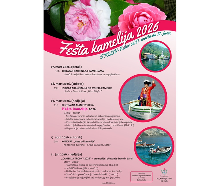 Fešta kamelija Stoliv ove godine donosi bogat program. Manifestacija počinje 27. marta 2026. godine obilaskom đardina sa kamelijama, sa ciljem razmijene iskustva sa uzgajivačima uz stručne savjete, saopštili su ogranizatori,