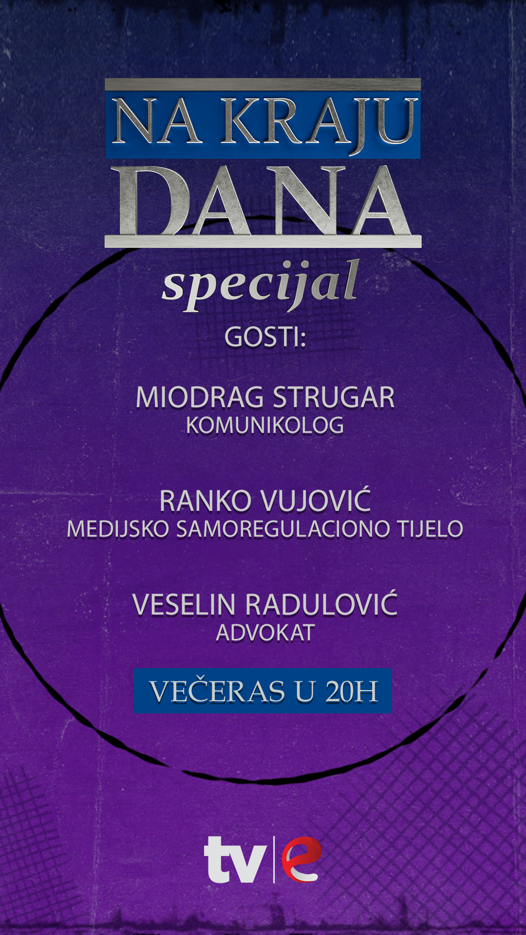 Gosti specijala "Na kraju dana" na Televiziji E večeras će biti komunikolog Miodrag Strugar, direktor Medisjko samoregulacionog tijela Ranko Vujović i advokat Veselin Radulović.