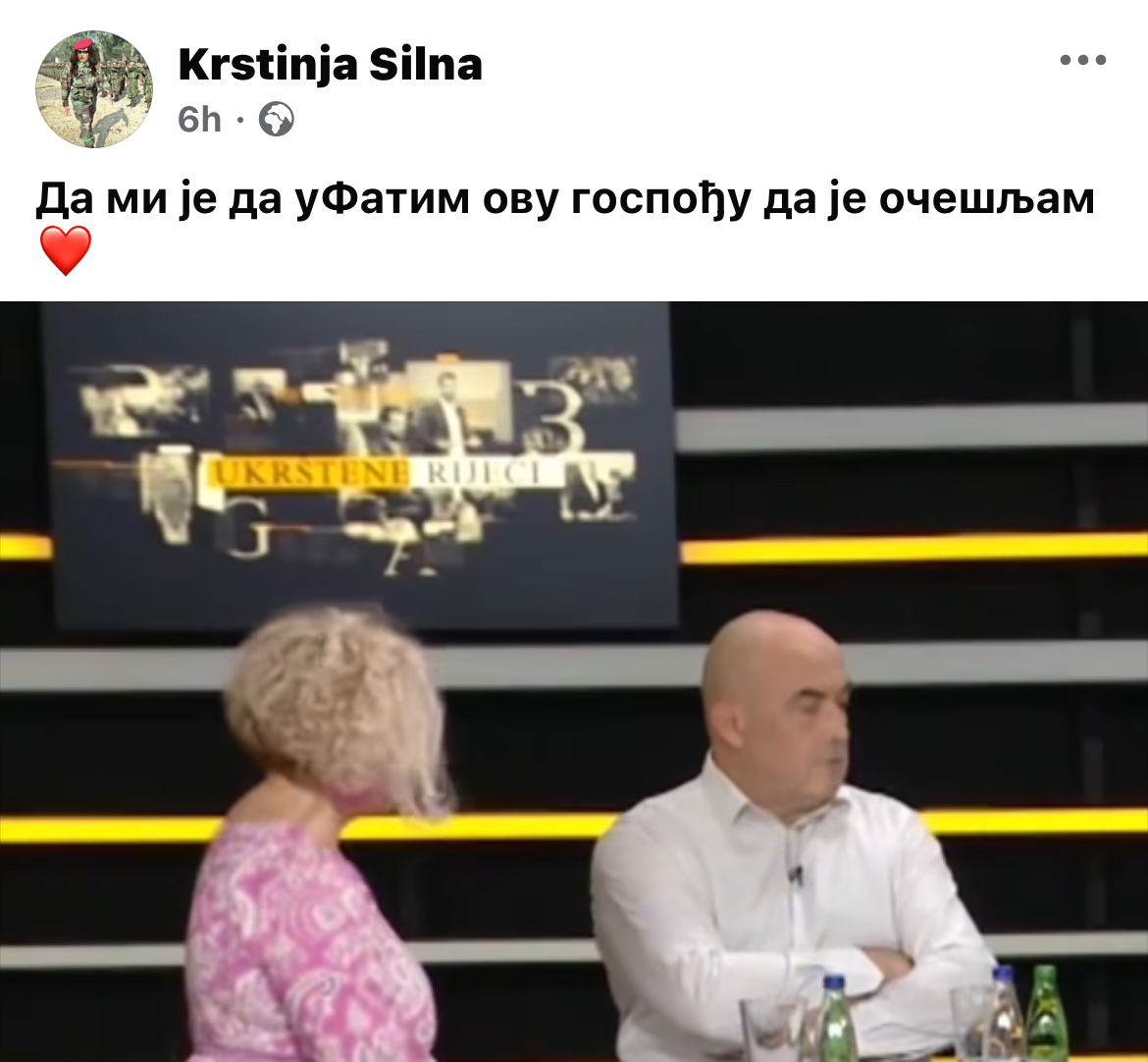 Umjesto argumentovanog odgovora na njene stavove - tvorac anonimnog profila obrušio se na njen fizički izgled - pa je u komentaru ispod isječka iz emisije i izjave Jovićević ostavio seksističku poruku: „Da mi je da ufatim ovu gospođu da je očešljam.“