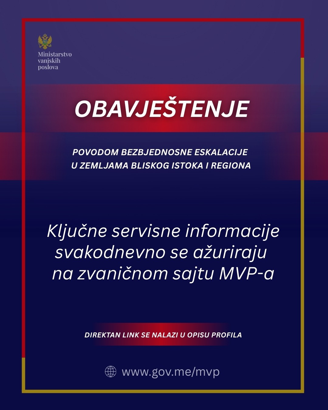 Ažurirane informacije o situaciji, uključujući podatke o vazdušnom saobraćaju, graničnim prelazima i procjeni bezbjednosnog rizika, objavljuju se na vebsajtu Ministarstva vanjskih poslova u rubrici „Izdvojene vijesti“.