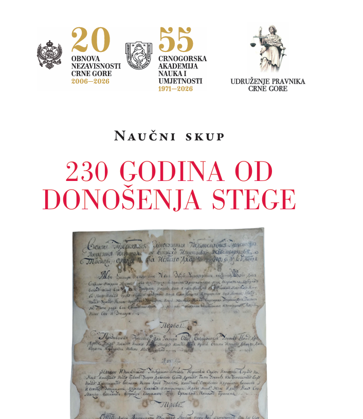 Crnogorska akademija nauka i umjetnosti (CANU) u saradnji sa Udruženjem pravnika Crne Gore organizuje 29. aprila naučni skup pod nazivom "230 godina od donošenja STEGE", s početkom u 11 sati.