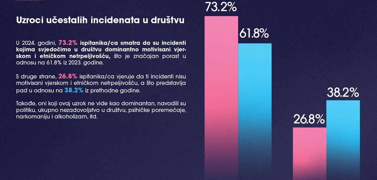 Kako navode iz te nevladine organizacije, u 2024. godini, 73.2% ispitanika/ca smatra da su incidenti kojima svjedočimo u društvu dominantno motivisani vjerskom i etničkom netrpeljivošću, što je značajan porast u odnosu i na ranije zabrinjavajući podatak iz 2023. godine kada je tu percepciju imalo 61.8% ispitanika/ca.