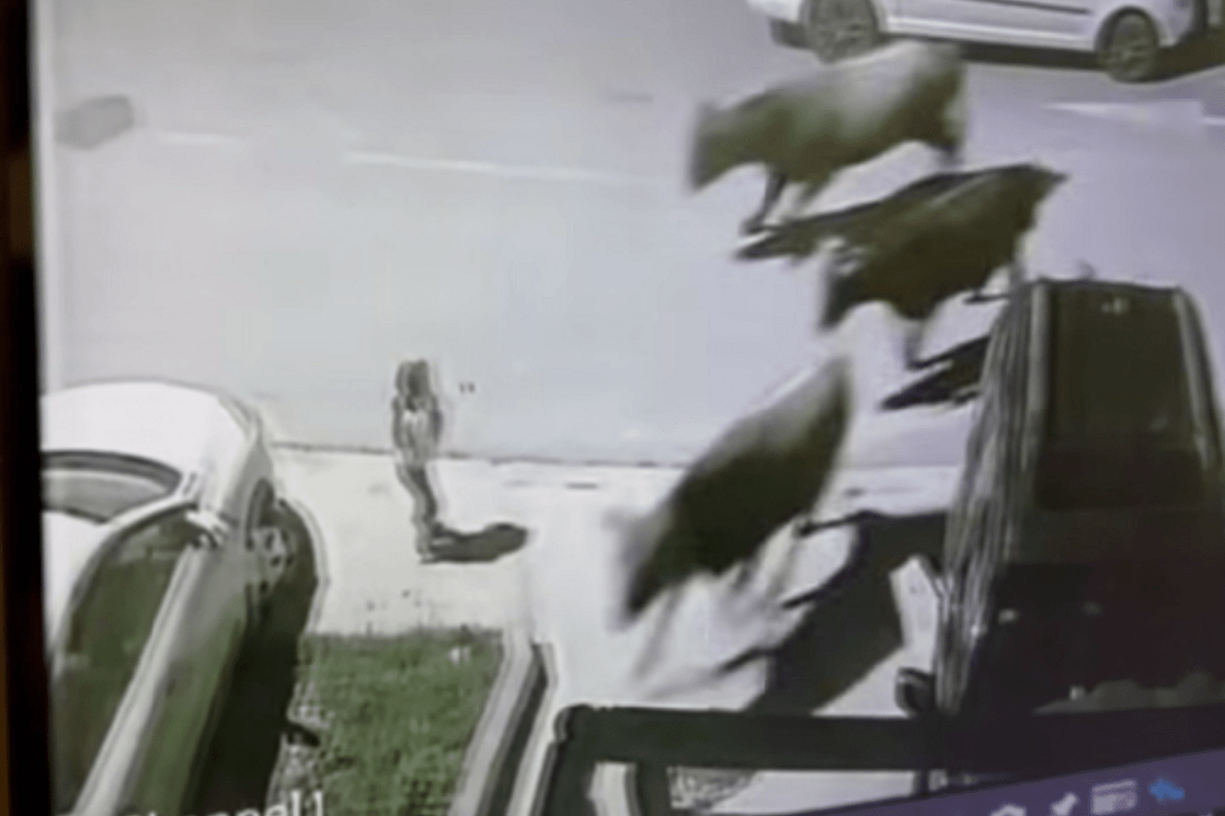 Na video-snimku objavljenom na društvenim mrežama vidi se dijete koje stoji između dva automobila na trotoaru, dok se nekoliko krava slobodno kreće ulicom i zatrčava prema djetetu.