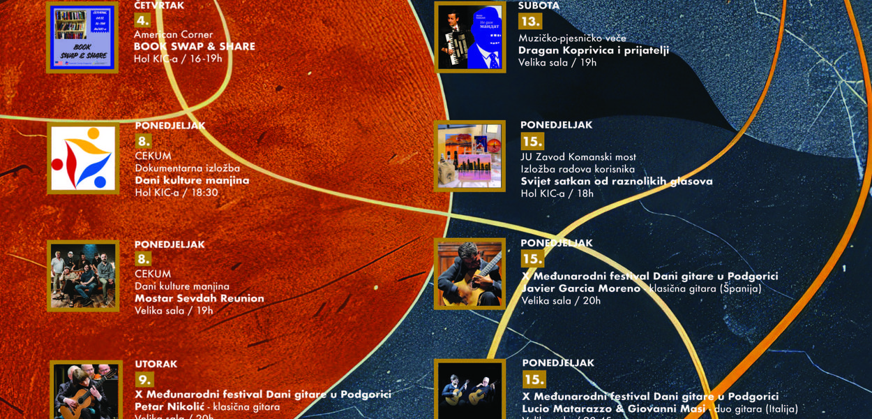 - Najavljujemo takođe da će se koncertom mladog crnogorskog virtuoza na gitari Petra Nikolića, 9. decembra nastaviti deseti međunarodni festival „Dani gitare u Podgorici”. Iste večeri, na velikoj sceni KIC-a nastupiće španski majstor flamenko gitare Huan Lorenco (Juan Lorenzo) uz pratnju plesačice An Sinel (Anne Sinel). U okviru istoimenog festivala španski virtuoz Havijer Garsija Moreno (Javier Garcia Moreno) prirediće koncert 15. decembra, a publici će se predstaviti i renomirani italijanski gitarski duo Lućo Mataraco & Đovani Mazi (Lucio Matarazzo & Giovanni Masi)- kazali su iz KIC-a.