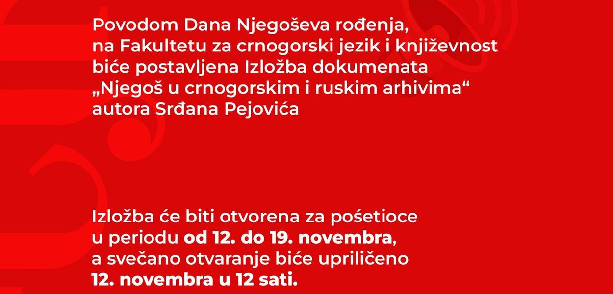 Povodom Dana Njegoševa rođenja, na Fakultetu za crnogorski jezik i književnost biće postavljen izbor dokumenata iz zbirke „Njegoš u crnogorskim i ruskim arhivima“, autora Srđana Pejovića.