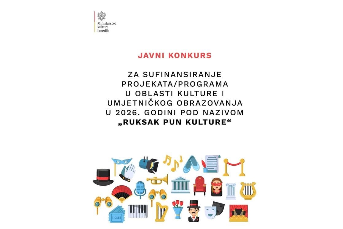 Ministarstvo kulture i medija raspisalo jenovi Javni konkurs za sufinansiranje projekata i programa u oblasti kulture i umjetničkog obrazovanja u 2026. godini, pod nazivom „Ruksak pun kulture“, koji je otvoren do 2. marta.