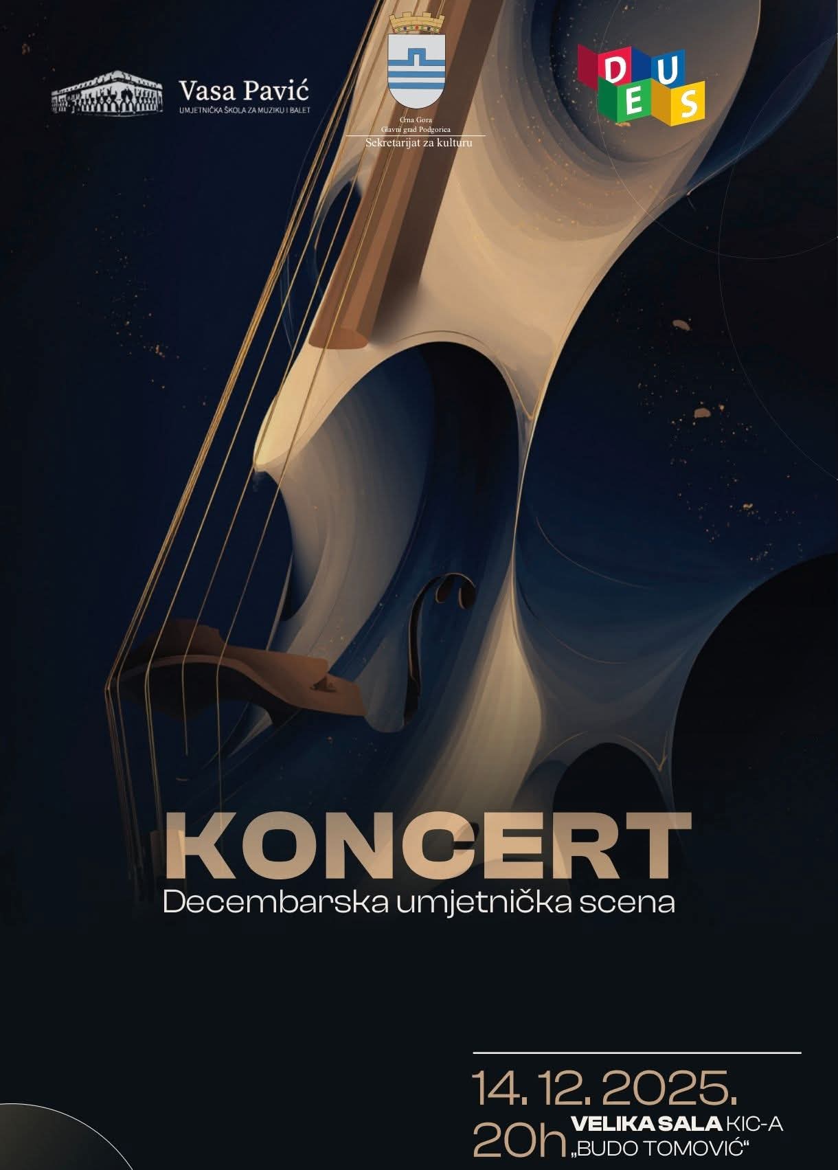U okviru manifestacije Decembarska umjetnička scena – DEUS 2025, Umjetnička škola za muziku i balet „Vasa Pavić“ prirediće koncert u nedjelju, 14. decembra, u Velikoj sali KIC-a „Budo Tomović“, sa početkom u 20 sati.