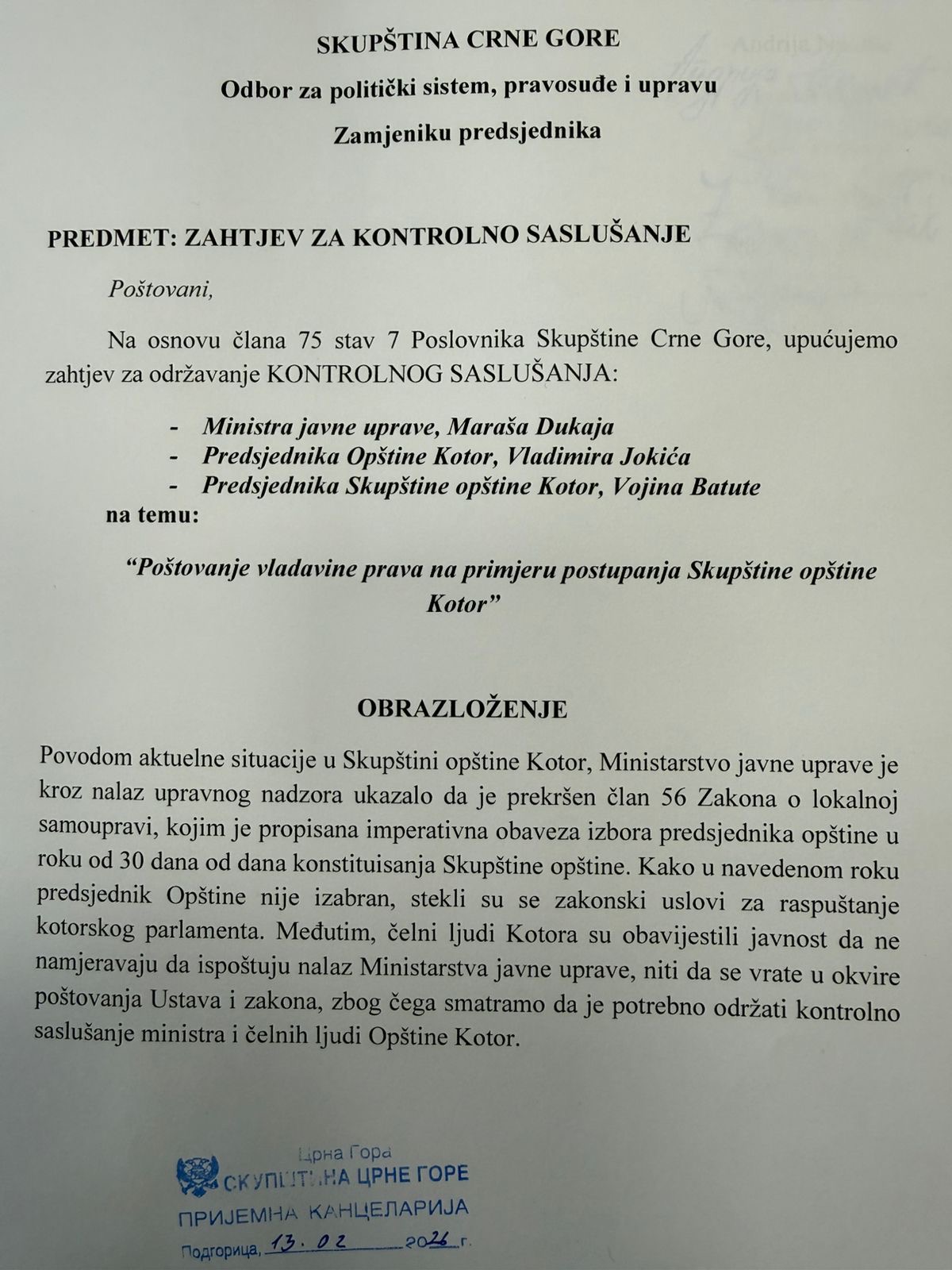 Poslanici parlamentarne opozicije podnijeli su Skupštini Crne Gore inicijativu za kontrolno saslušanje ministra javne uprave Maraša Dukaja, predsjednika Opštine Kotor Vladimira Jokića i predsjednika Skupštine opštine Kotor Vojina Batute, na temu — Poštovanje vladavine prava na primjeru postupanja Skupštine opštine Kotor.