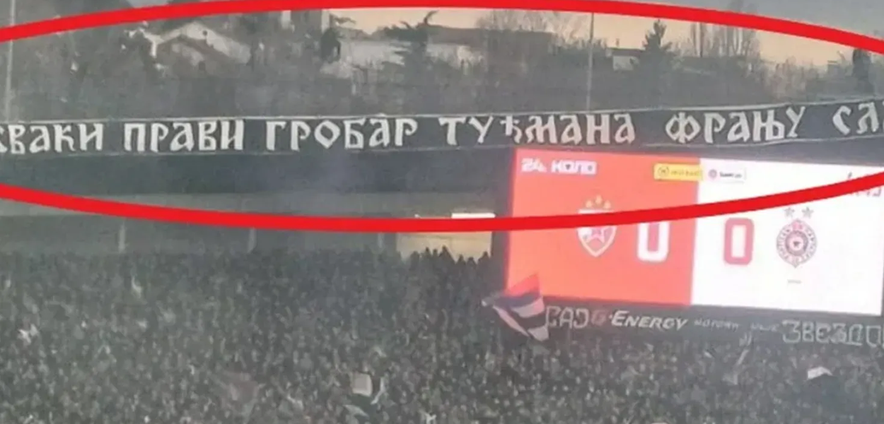 Navijači Crvene zvezde okačili su gostujućim pristalicama parolu o Franji Tuđmanu iznad njihove južne tribine na stadionu Rajko Mitić.