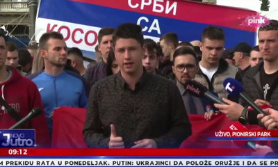Beograd: Ćaci se uključio uživo u program, iza njega prolaze kapuljaši za koje se pretpostavlja da su ubačeni elementi